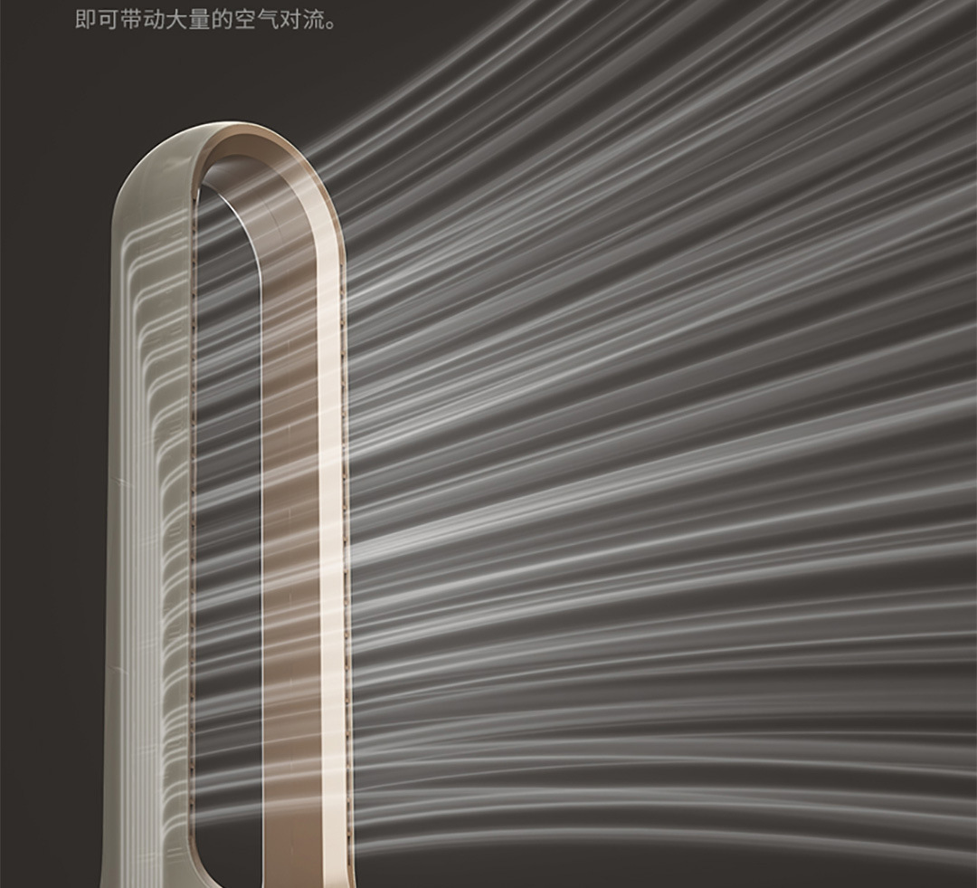 Innovative air duct shaping, utilizing the Kondrat effect to significantly increase the utilization rate of air flow. The air flows around the ring-shaped inner lip of the fan head, driving surrounding air to blow out with a surging cool breeze.